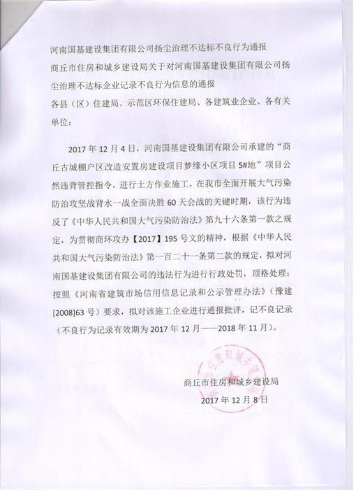 关于对河南国基建设集团有限公司扬尘治理不达标不良行为的通报